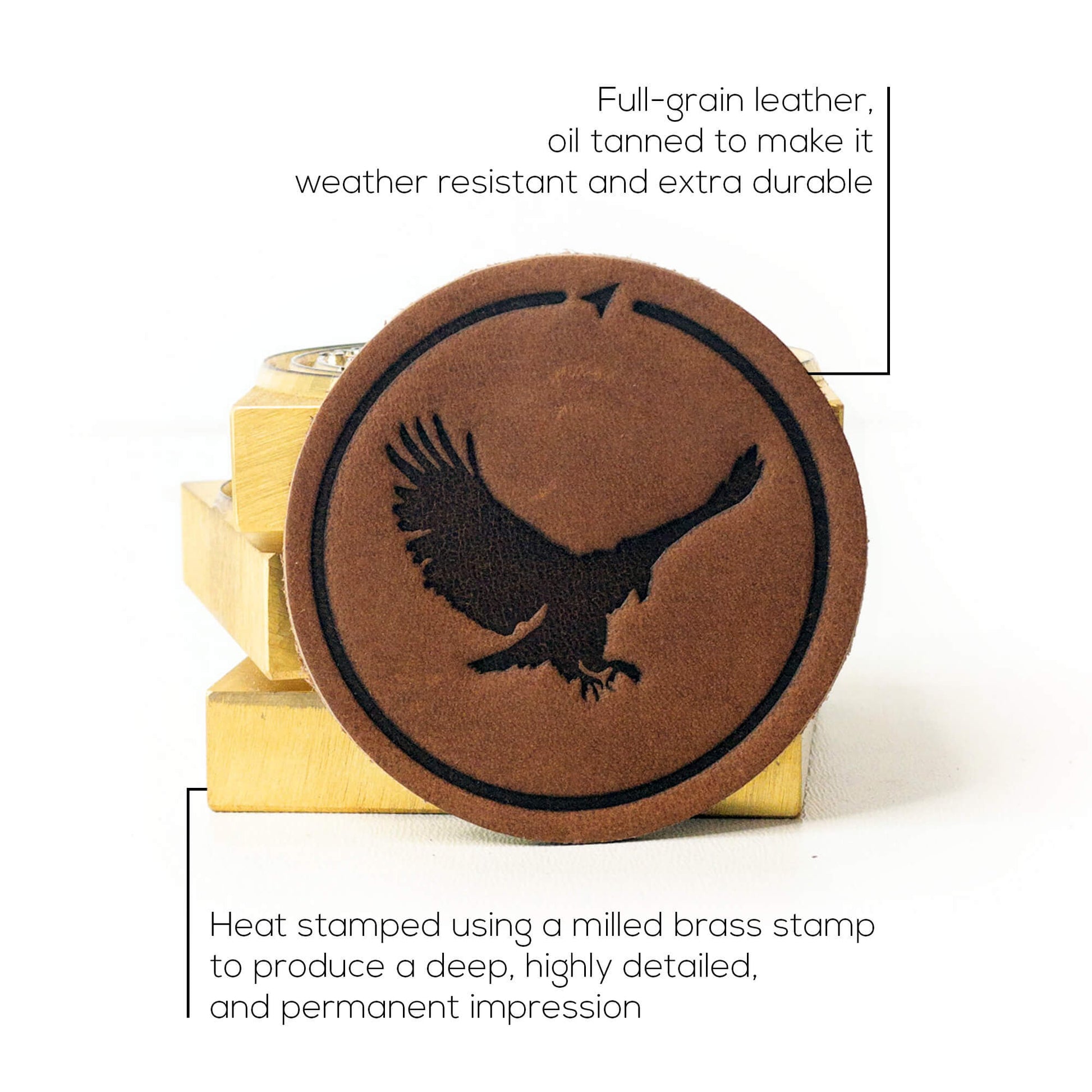 Our leather patches are heat stamped using a milled brass stamp. It produces a deep, highly detailed and permanent impression on the leather that doesn't fade over time like a lasered patch.