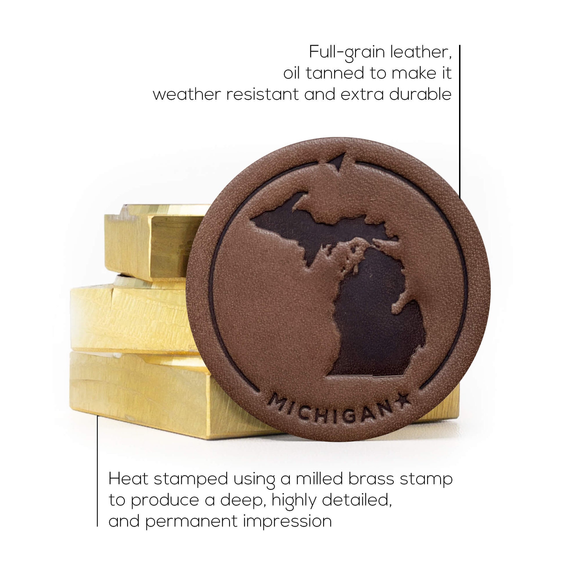 Our leather patches are heat stamped using a milled brass stamp. It produces a deep, highly detailed and permanent impression on the leather that doesn't fade over time like a lasered patch.