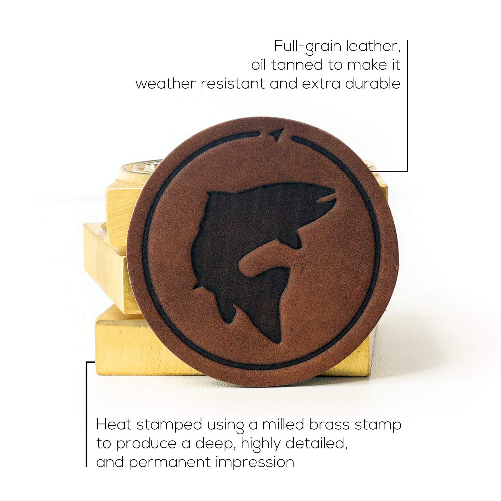 Our leather patches are heat stamped using a milled brass stamp. It produces a deep, highly detailed and permanent impression on the leather that doesn't fade over time like a lasered patch.