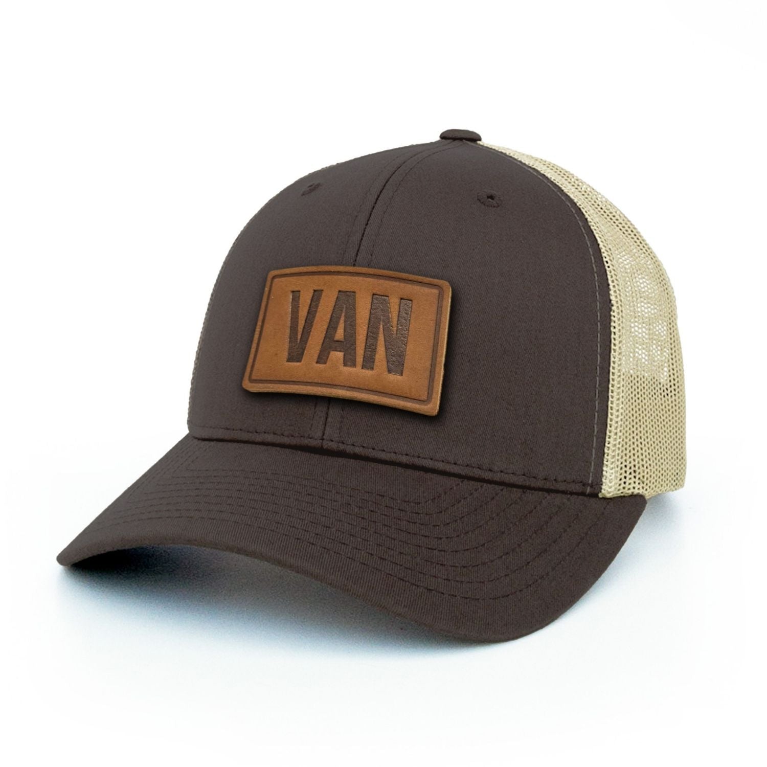 VAN. Vancouver is home. A leather patch trucker hat, heat-stamped in full-grain leather. Handcrafted in Ottawa.